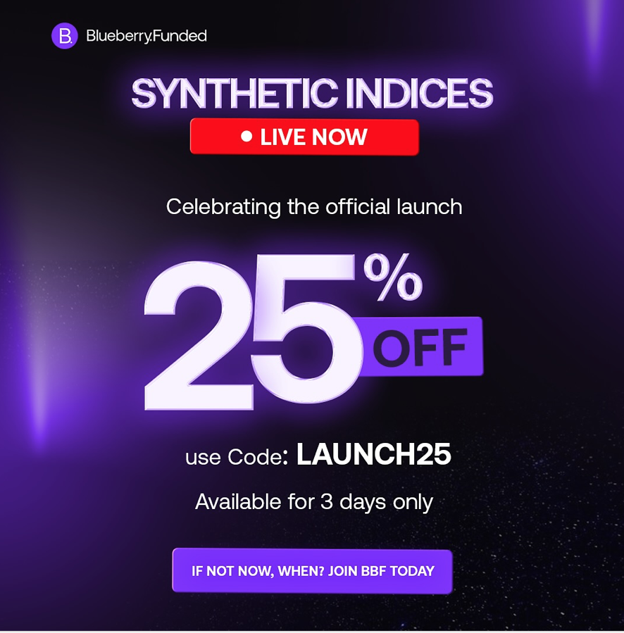To celebrate the launch, Blueberry Funded is offering a 25% discount on all synthetic challenges. The promotion is aimed at encouraging traders to explore the new offering and is accessible through the discount code “LAUNCH25.” According to the firm, the synthetic indices allow traders to experience “real volatility, fast markets, and faster funding” — elements that align with the firm’s goal of providing flexible and performance-driven funding solutions.