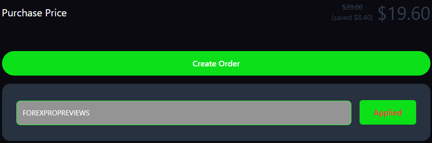 - Apply Discount Code – Apply our discount code FOREXPROPREVIEWS and enjoy a 30% discount on all funding program types.