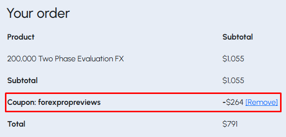 - Apply Discount Code – Apply our discount code FOREXPROPREVIEWS and enjoy a 25% discount on all funding program types.
