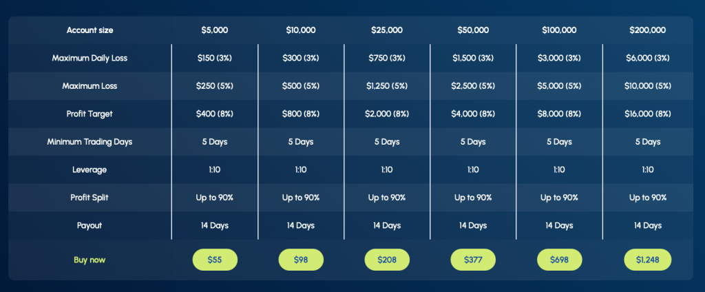 Funded Prime’s One-phase Challenge provides traders with the opportunity to manage account sizes ranging from $5,000 up to $200,000. The aim is to identify disciplined traders who are profitable and can efficiently manage risk throughout a one-step evaluation period. The One-phase Challenge allows you to trade with leverage up to 1:50.