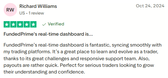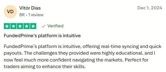 Another client highlighted Funded Prime’s real-time dashboard, noting that it syncs seamlessly with their trading platforms and enhances the overall trading experience. They praised the firm’s educational challenges and responsive support team, which they found valuable for learning and development. The client also pointed out the quick payout process, describing Funded Prime as an excellent choice for serious traders aiming to grow both their confidence and market understanding.
