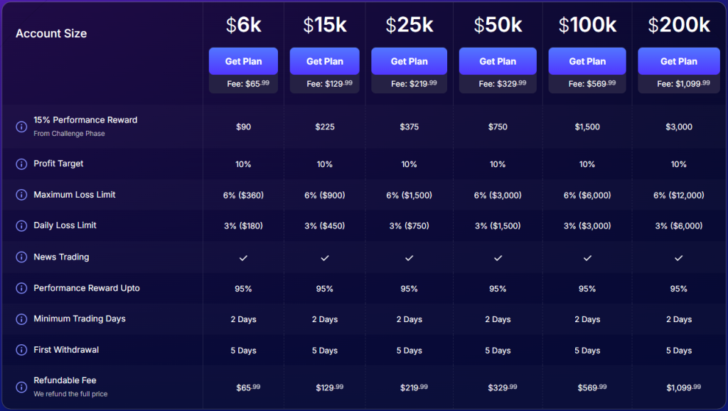 - Maximum Loss – The maximum loss limit a trader is allowed to lose overall without breaching the account. All account sizes have a maximum loss of 6%.