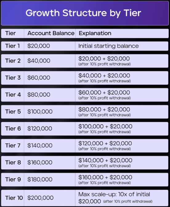 FundedNext’s Two-step Stellar Challenge is an industry-standard two-step evaluation that requires the completion of two phases before becoming eligible to manage a funded account and earn 80% up to 95% profit splits. Traders must reach profit targets of 8% in phase one and 5% in phase two to become successfully funded. These are realistic trading objectives, considering you have a 5% maximum daily and 10% maximum loss rules to follow. Regarding time limitations, you have no maximum trading day requirements during either evaluation phase. However, you are required to trade for a minimum of 5 calendar days in each evaluation phase. Finally, it’s essential to note that the Two-step Stellar Challenge features a scaling plan, providing you with the opportunity to increase your initial account balance.