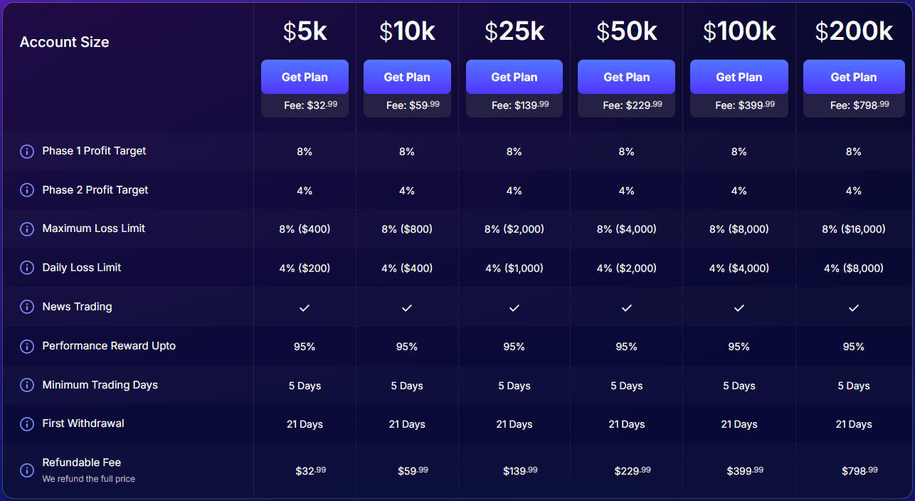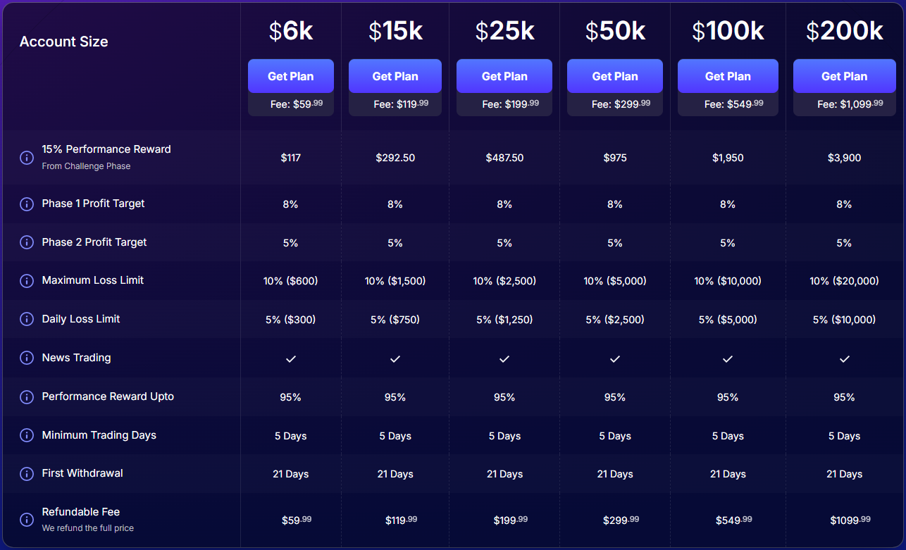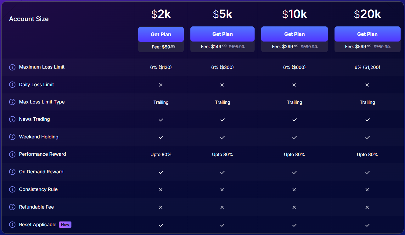 | Account Size | Price (Standard) | Price (Swap-free) |
