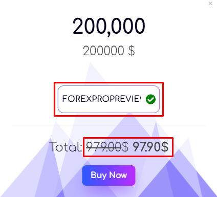 - Apply Discount Code – Apply our discount code FOREXPROPREVIEWS and enjoy a 90% discount on all FundedTop account types.