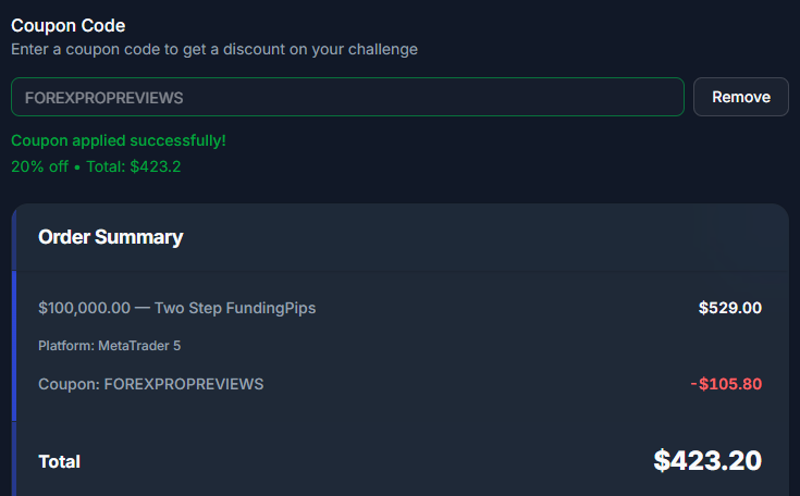 - Apply Discount Code – Apply our discount code FOREXPROPREVIEWS and enjoy a 20% discount on all FundingPips account types and 5% after your first purchase.