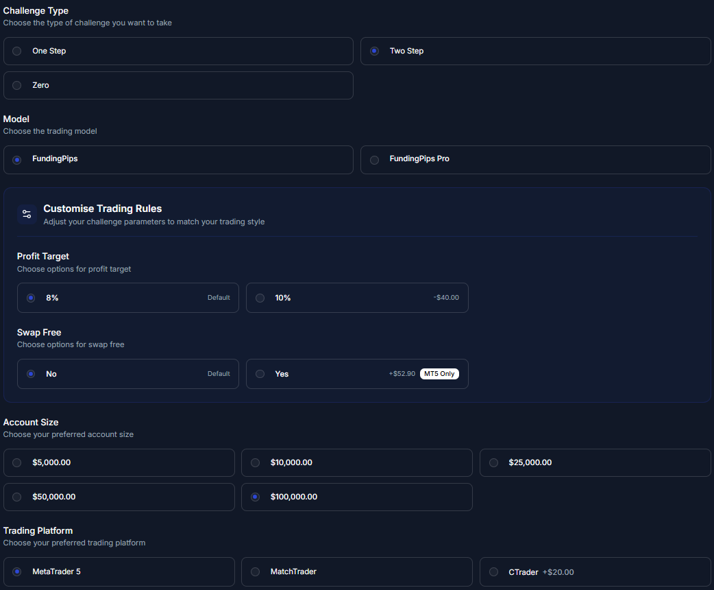FundingPips Two-step Evaluation provides traders the opportunity to manage account sizes ranging from $5,000 up to $100,000. The aim is to identify talented traders who are profitable and can efficiently manage risk throughout the two-step evaluation period. The Two-step Evaluation allows you to trade with up to 1:100 leverage.