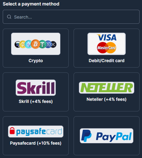 - Choose Your Payment Method – Choose between a credit/debit card, Google Pay, Skrill, Neteller, Paysafe Card, PayPal, and a cryptocurrency payment method.