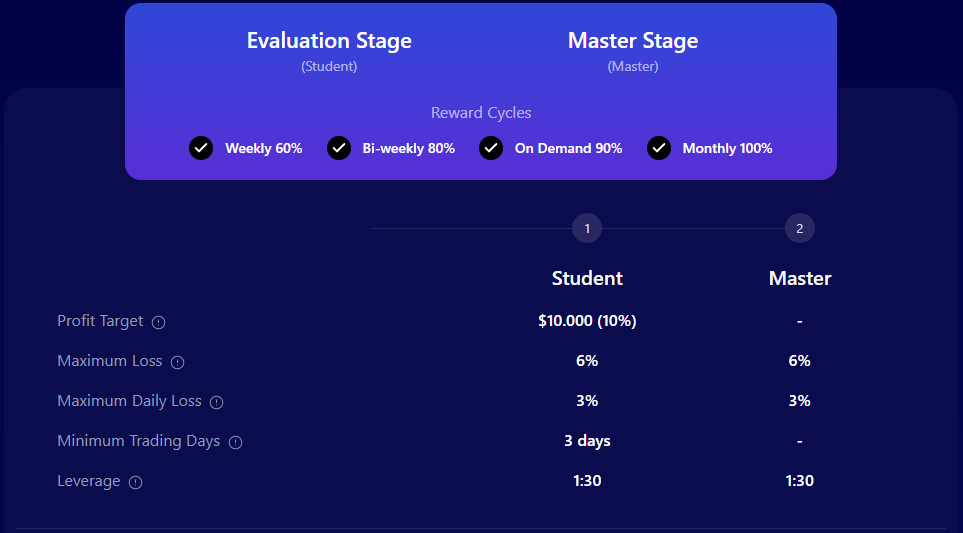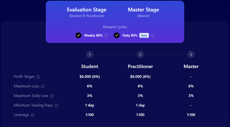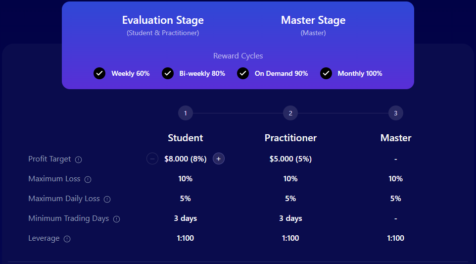 FundingPips believes that traders undergo three essential stages during their professional development: Student, Practitioner, and Master. Traders have the opportunity to earn substantial profits, with the flexibility to manage account sizes up to $100,000 and receive up to 100% profit splits. This can be through trading various financial instruments, including forex pairs, commodities, indices, and cryptocurrencies.
