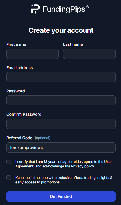 - Registration Form – Register with FundingPips by filling out the registration form with your personal details and logging into the trading dashboard.