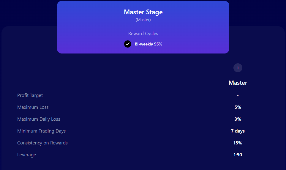 - Receiving capital from the Two-step Evaluation is realistic primarily due to its relatively modest profit targets (8% or 10% in phase one and 5% in phase two) coupled with average maximum loss rules (5% maximum daily, scaleable up to 7% and 10% maximum loss, scaleable up to 14%). It is important to note that there are no maximum trading day requirements while having a minimum trading day requirement of 3 calendar days. Furthermore, upon successfully completing both evaluation phases, participants qualify for payouts featuring an advantageous profit split of 60% up to 100% and a monthly salary.