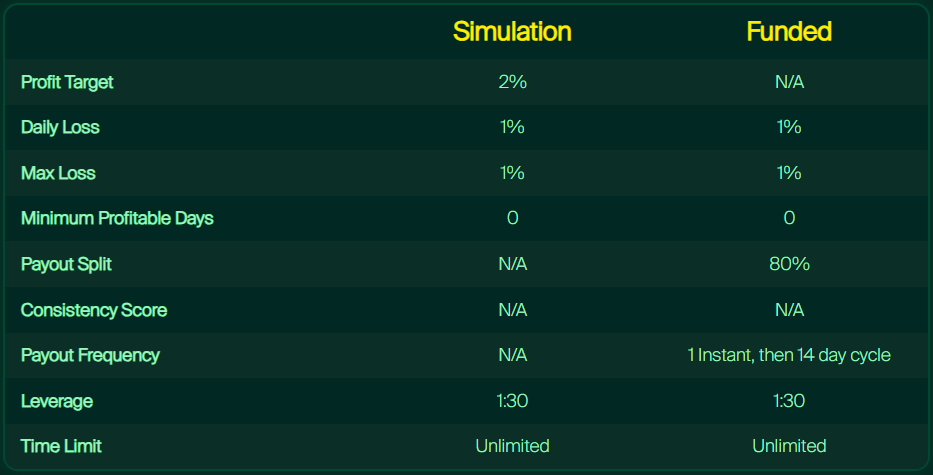 Leveraged’s Sprint Challenge is a one-step evaluation that requires traders to reach a 2% profit target to qualify for a funded account and earn an 80% profit split. The controlled risk framework, which includes a 1% maximum daily loss and a 1% maximum loss, allows traders to move through the evaluation quickly without excessive exposure. With no minimum or maximum trading day requirements, Sprint gives traders the flexibility to secure funding as fast as their performance allows. While the Sprint program does not include a scaling plan, it stands out as one of the fastest paths to funded trading within Leveraged.