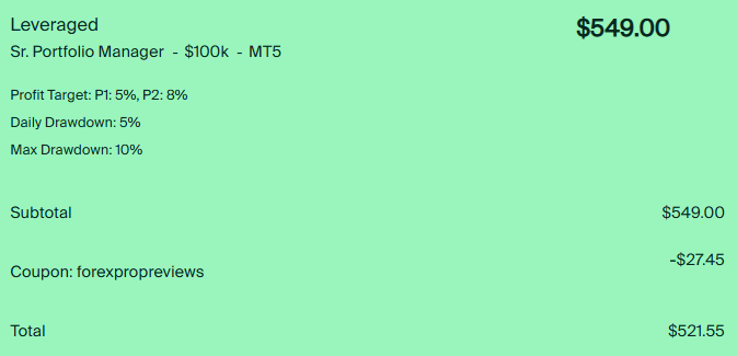 - Apply Discount Code – Apply our discount code FOREXPROPREVIEWS and enjoy a 5% discount on all funding program types.