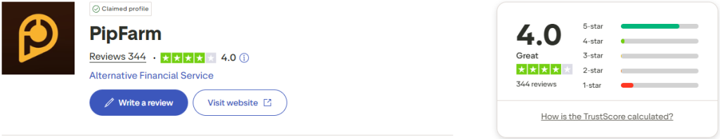 On Trustpilot, PipFarm has a large variety of their community commenting and providing positive feedback regarding their company services. The firm has achieved an impressive rating of 4.0 out of 5 from a pool of 344 reviews. Notably, 87% of these reviews have awarded PipFarm the highest rating of 5 stars.