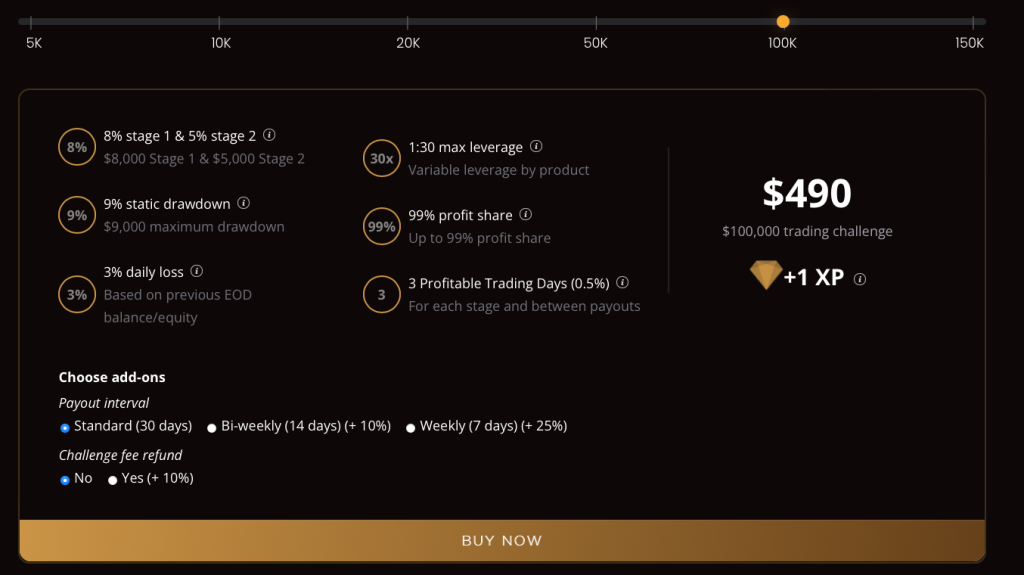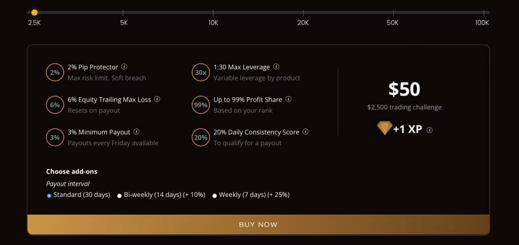 PipFarm’s Instant Funding provides traders with the opportunity to manage account sizes ranging from $2,500 up to $100,000. The aim is to identify disciplined traders who are profitable and can efficiently manage risk throughout a one-step evaluation period. The Trailing Evaluation allows you to trade with leverage up to 1:30 (1:50 leverage by reaching the 50 XP milestone).