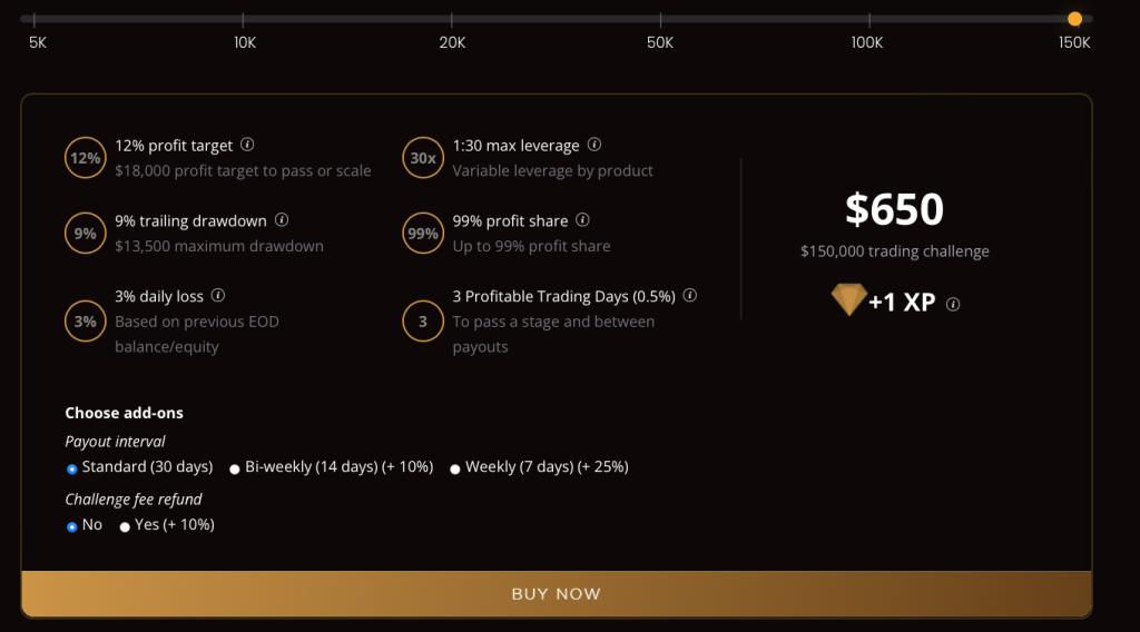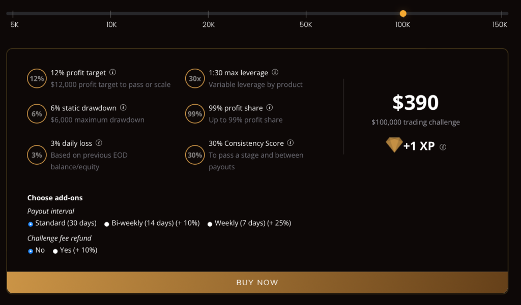 PipFarm’s Trailing Evaluation provides traders with the opportunity to manage account sizes ranging from $5,000 up to $300,000. The aim is to identify disciplined traders who are profitable and can efficiently manage risk throughout a one-step evaluation period. The Trailing Evaluation allows you to trade with leverage up to 1:30 (1:50 leverage by reaching the 50 XP milestone).