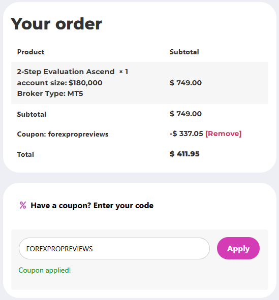 - Apply Discount Code – Apply our discount code FOREXPROPREVIEWS and enjoy a 45% discount on all SFX Funded account types.
