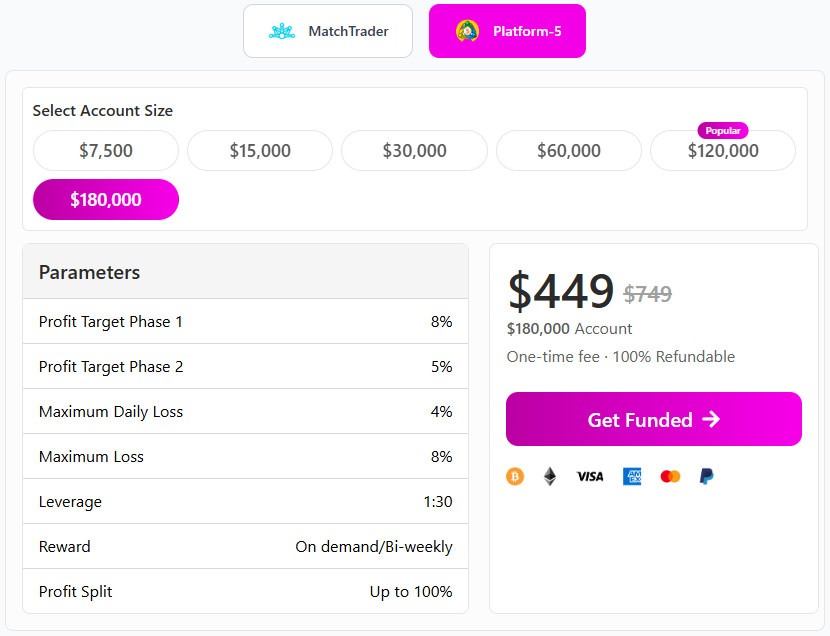 | Maximum Loss | 7% (trailing) | 6%, 8%, or 10% (Trailing) |