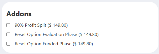 - Choose Your Account – Choose your account type, account size, trading platforms, and add-on features.