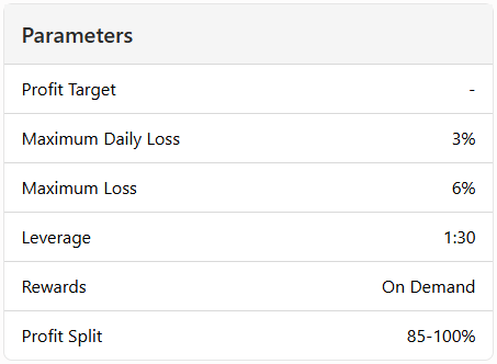 - Maximum Loss – The maximum overall loss is set at 6%, representing the total allowable drawdown on the account. Exceeding this limit leads to account termination.
