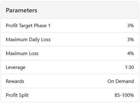 - Maximum Loss – The maximum overall loss is set at 4%, representing the total allowable drawdown on the account. Exceeding this limit leads to account termination.