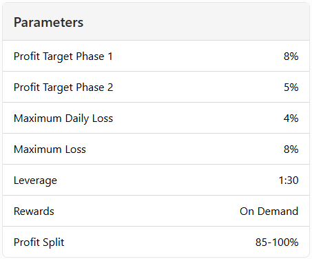 Phase One requires traders to achieve a profit target of 8% while respecting the 4% maximum daily loss and 8% maximum trailing loss rules. There is no maximum trading period, but a minimum of 5 trading days is required. To advance to Phase Two, traders must reach the 8% profit target without breaching any risk limits.