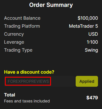 - Apply Discount Code – Apply our discount code FOREXPROPREVIEWS and enjoy a 20% discount on all funding program types.