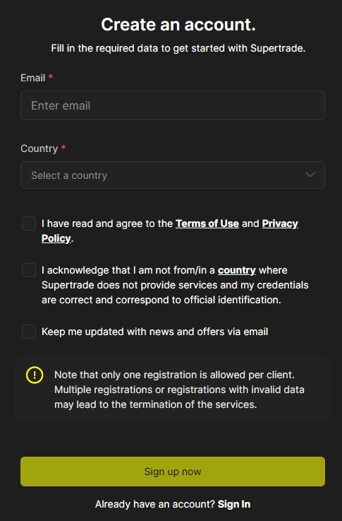 - Registration Form – Register with SuperTrade by filling out the registration form with your personal details and logging into the dashboard.