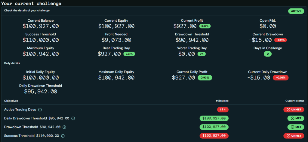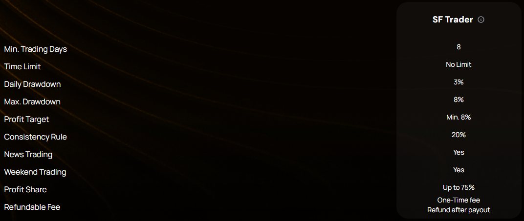 - Minimum Trading Days – The minimum duration during which you must engage in trading before successfully concluding an evaluation phase. Once funded, you have a minimum trading day requirement of 8 days.