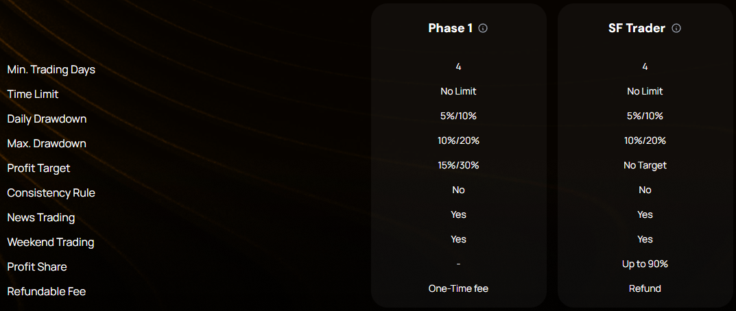 Sway Funded Rapid Challenge is a one-step evaluation that requires traders to successfully complete a single phase before becoming eligible for payouts. The profit target is 15%/30%, with a 5%/10% maximum daily and 10%/20% maximum loss rules. You also have no maximum trading day requirements during the evaluation phase. However, you are required to trade for a minimum of 4 calendar days during the evaluation phase. Keep in mind that the Rapid Challenge doesn’t have a scaling plan. Compared to other funding programs within the industry, the Rapid Challenge stands out mainly for having an unlimited trading period, numerous add-on features, straightforward trading rules, and competitive account pricing.