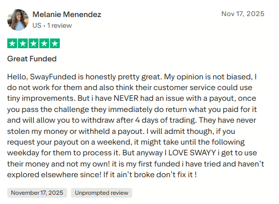 This client described their experience with Sway Funded as largely positive, noting that while customer service could see minor improvements, they had never experienced issues with payouts. They explained that once a challenge is passed, the firm promptly refunds the challenge fee and allows withdrawals after four trading days. The client emphasized that payouts have always been honored, with the only delay occurring when requests are made over the weekend. As their first funded trading experience, they expressed strong satisfaction with using Sway Funded’s capital instead of their own and stated that they have not felt the need to explore other firms due to their positive experience.