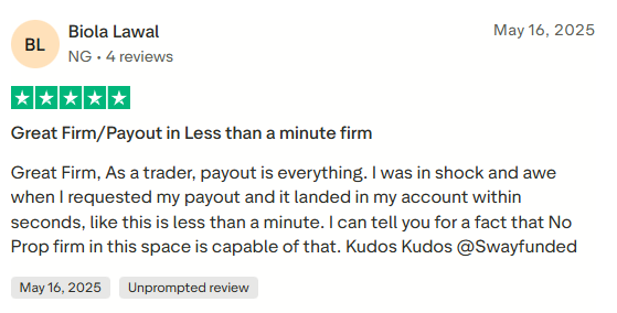 Another client described Sway Funded as an excellent firm, emphasizing that fast payouts are the most important factor in their trading experience. They shared that after requesting a payout, the funds arrived in their account within seconds, which they found exceptional compared to other prop firms in the industry. Based on this experience, the client expressed strong appreciation for Sway Funded’s payout efficiency and reliability.