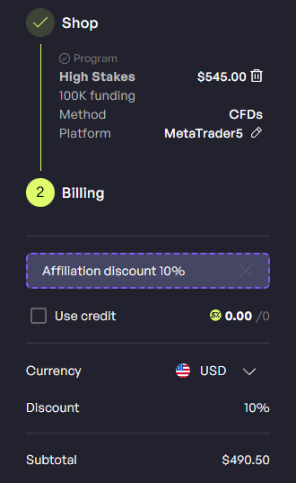 - Choose Your Account – Choose your account type, account size, payment currency, and trading platform.