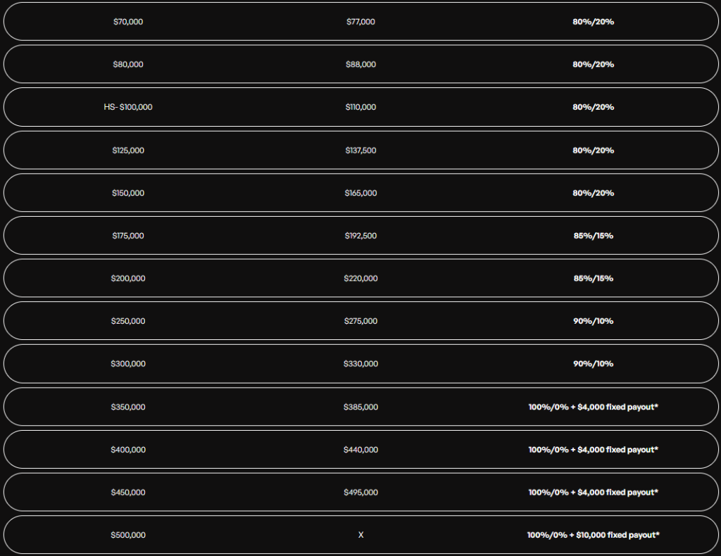 The profit split depends on the funding program and the trader’s progression within the scaling system. For example, traders in the Hyper Growth and Bootcamp programs start with a 50% profit split, which can increase gradually up to 100% as they progress through the scaling structure. Meanwhile, traders participating in the New High Stakes and Classic High Stakes program start with a higher 80% profit split, which can also scale up to 100% depending on performance. And lastly, traders in the Pro Growth program start with a 75% profit split, which can be increased up to 80% through the scaling plan.
