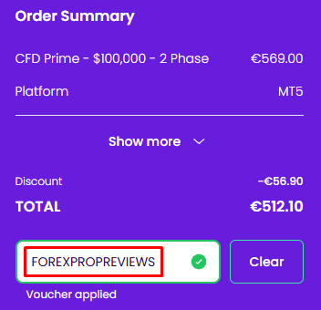- Apply Discount Code – Apply our discount code FOREXPROPREVIEWS and enjoy a 10% discount on all The Trading Pit account sizes.