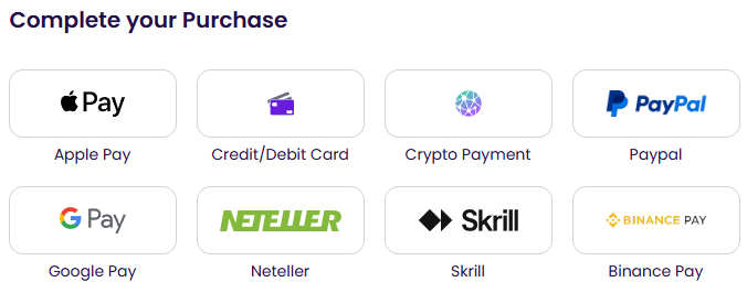 - Choose Your Payment Method – Choose between Apple Pay, Google Pay, Binance Pay, PayPal, Skrill, Neteller, cryptocurrency, and credit/debit card payment methods.