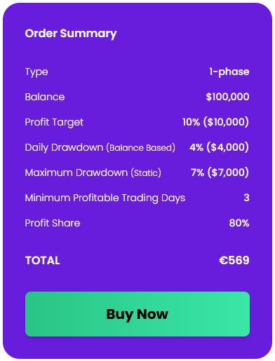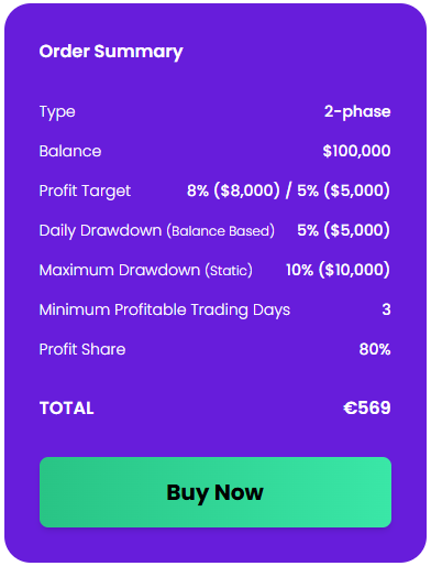 - Profit Target – Traders must achieve a designated profit percentage in order to successfully complete the evaluation phases or qualify for account scaling. In the Two-Phase Challenge, Phase One requires an 8% profit target, while Phase Two requires a 5% profit target. Funded accounts have a $100 minimum withdrawal requirement.