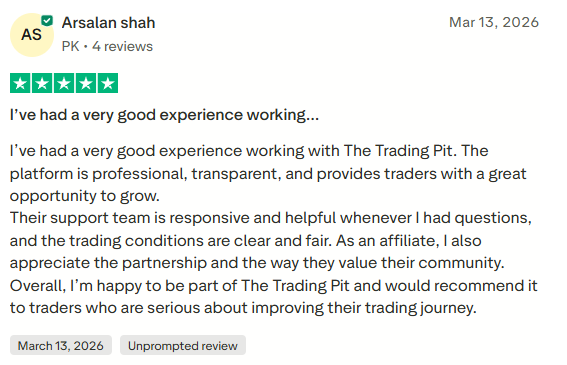 This review reflects a very positive experience with The Trading Pit, highlighting its professional platform, transparent conditions, and fair trading environment. The user also emphasizes the responsive support team, which contributes to a smooth overall experience. Additionally, the mention of a positive affiliate relationship suggests that the firm values its community and partnerships.