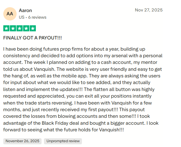 A client with prior futures prop trading experience shared that they discovered VanquishTrader through their mentor and found both the website and mobile app easy to use. They appreciated that the firm actively listens to trader feedback and implements requested features, specifically highlighting the useful “flatten all” button for quickly exiting positions. After trading with VanquishTrader for a few months, the client received their first payout, which exceeded their expectations, and they later upgraded to a larger account during a Black Friday promotion. They expressed optimism about the firm’s future and ongoing improvements.