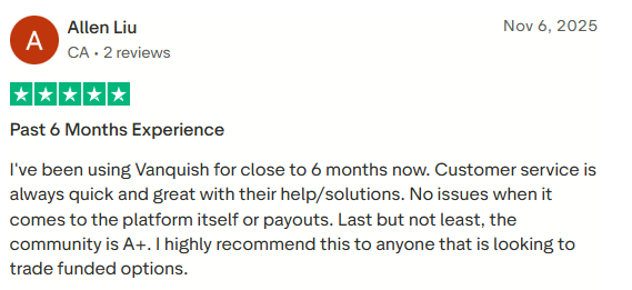 Another client shared that they had been using VanquishTrader for nearly six months and consistently experienced fast and helpful customer support. They reported no issues with the trading platform or payouts and highlighted the strong and supportive community as a major positive. Based on their experience, the client recommended VanquishTrader to traders interested in funded options trading.