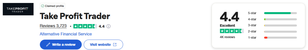 On Trustpilot, Take Profit Trader has a large variety of their community commenting and providing positive feedback regarding their company services. The firm has achieved an excellent rating of 4.4 out of 5 from a substantial pool of 3,723 reviews. Notably, 82% of these reviews have awarded Take Profit Trader the highest rating of 5 stars.