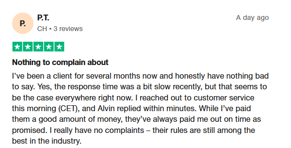 The client gave Take Profit Trader a 5-star review, praising them as one of the top futures prop firms in the industry. They noted that although the response time was slightly slower recently, support still replied within minutes when contacted. The reviewer highlighted the firm’s reliability in consistently paying out on time, even after larger profits. They emphasized the clear rules and fairness of the platform, calling them among the best in the industry.