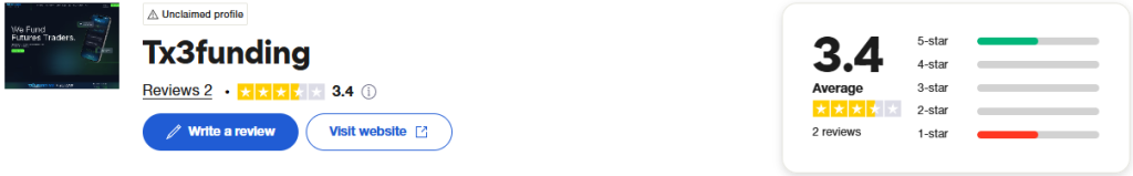 On Trustpilot, TX3Funding Futures has a large variety of its community commenting and providing positive feedback regarding their company services. The firm has achieved an average rating of 3.4 out of 5 from a substantial pool of 2 reviews. Notably, 50% of these reviews have awarded TX3Funding Futures the highest rating of 5 stars.