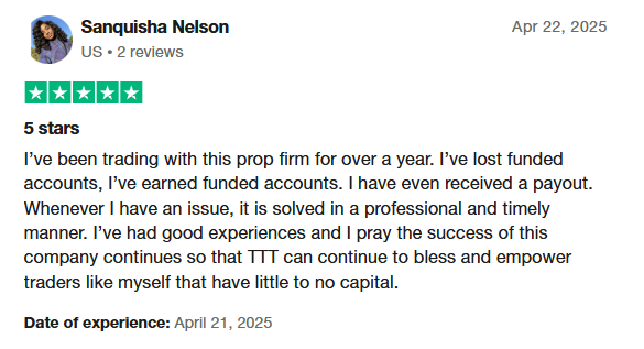 In the first review, the user expressed high satisfaction with TX3Funding Futures. They shared that they had been with the firm for over a year and experienced both successes and challenges, including losing and earning funded accounts. Despite the ups and downs, they received a payout and praised the company’s professional and timely support. They appreciated the opportunity to trade even with limited capital and expressed hope for the company’s continued success in empowering traders.