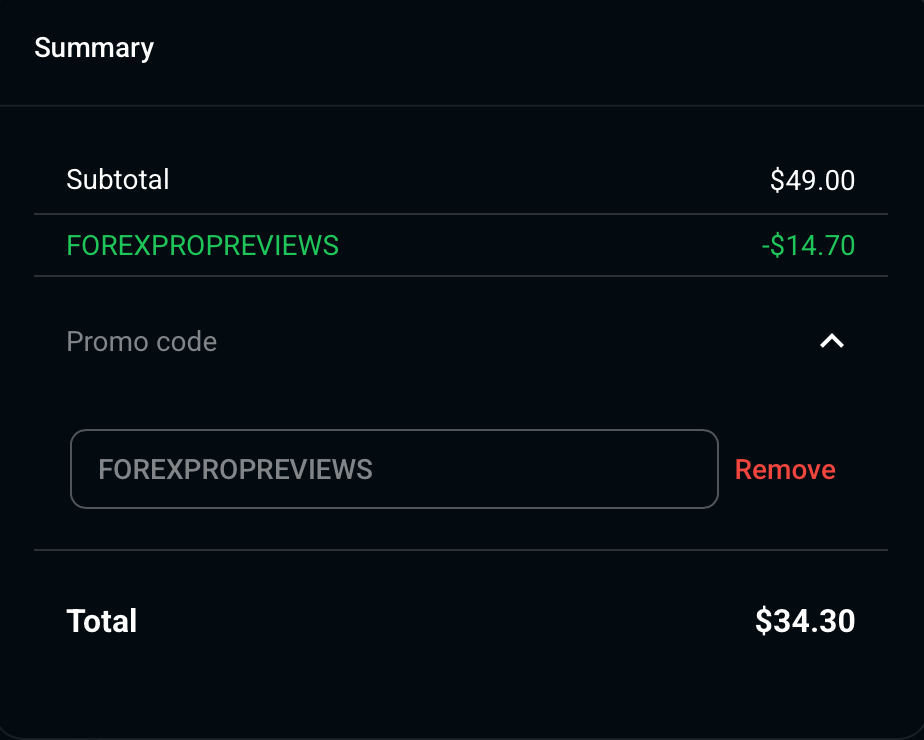 After you have selected your challenges and other options, on the right side of the screen, you will see the tab for Promo Code. Add the Discount Code (FOREXPROPREVIEWS). As you can see, we have already added the discount code and it is applied.